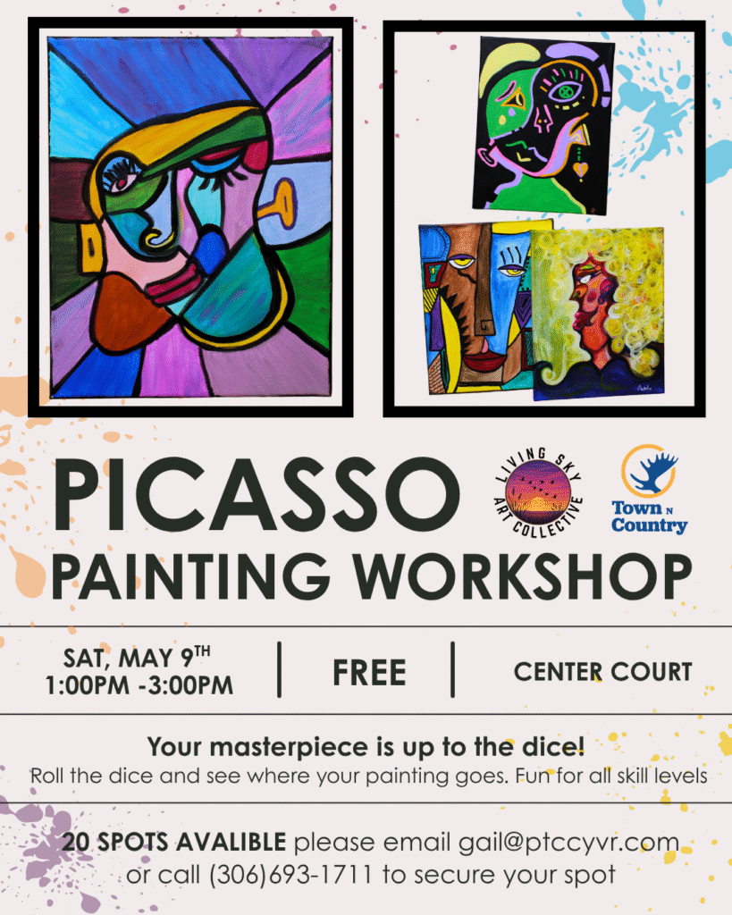 Join us on Saturday, May 9th from 1–3 PM in Center Court for a fun and creative experience with Living Sky Art Collective. Roll the dice and let chance guide your Picasso-inspired painting in this unique, hands-on event. Spots are limited to just 20 participants, so be sure to pre-register by emailing gail@ptccyvr.com or calling the office (306)693-1711. Best of all, it’s completely FREE!